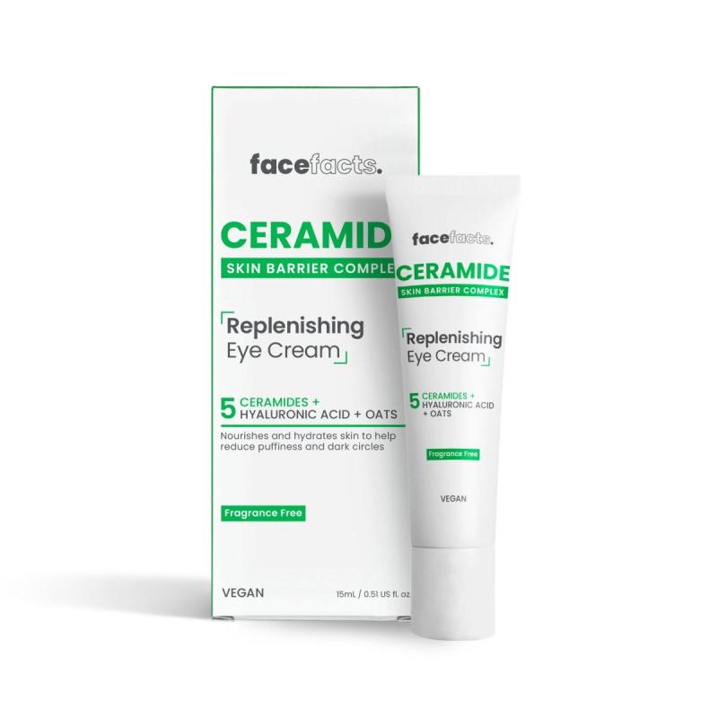 FaceFacts Ceramide Replenishing Eye Cream is formulated to deliver targeted hydration and barrier support to the sensitive skin around the eyes. Ceramides, essential lipids naturally found in the skin, help restore and maintain the skin’s protective barrier, preventing moisture loss and dryness.