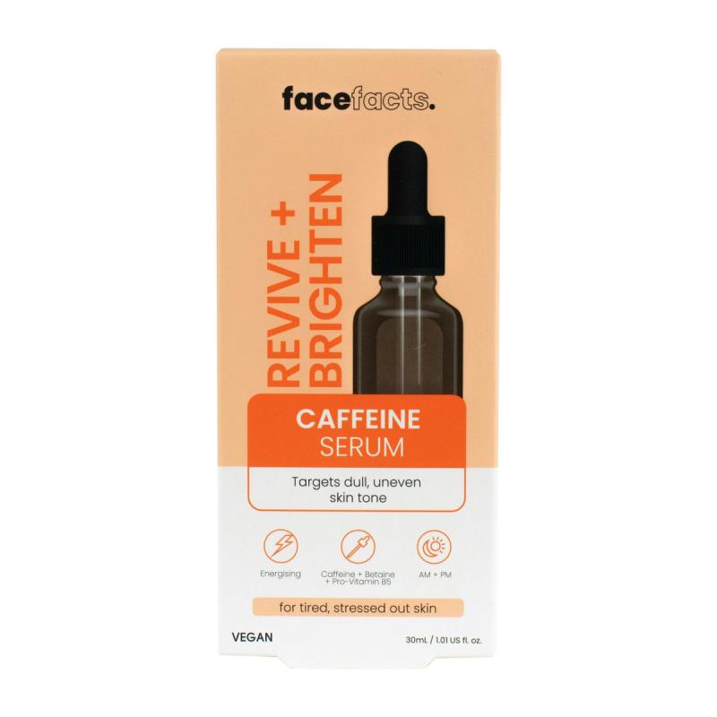 - FaceFacts Revive & Brighten Energizing Caffeine Facial Serum is designed to awaken dull, tired-looking skin and restore a healthy glow. Powered by caffeine, a well-known antioxidant, this serum helps to visibly reduce puffiness and improve skin brightness, giving your complexion a refreshed appearance.