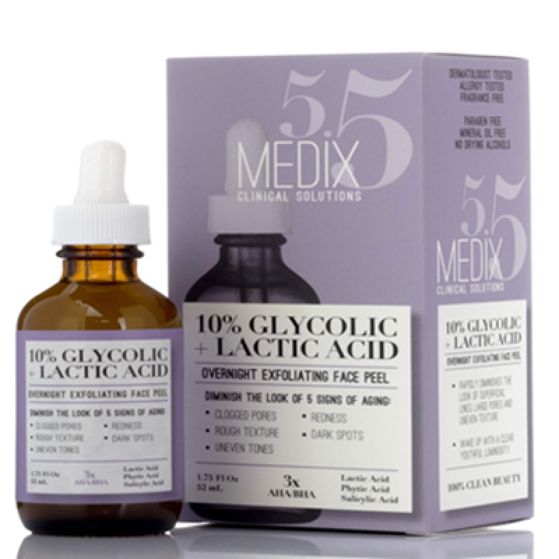 - Medix 5.5 10% Glycolic + Lactic Acid Overnight Exfoliating Face Peel & Serum is an advanced chemical exfoliant designed to help renew and refresh the skin’s surface. Formulated with alpha hydroxy acids (AHAs), it works overnight to help dissolve dead skin cells, revealing a smoother and more even-looking complexion over time.